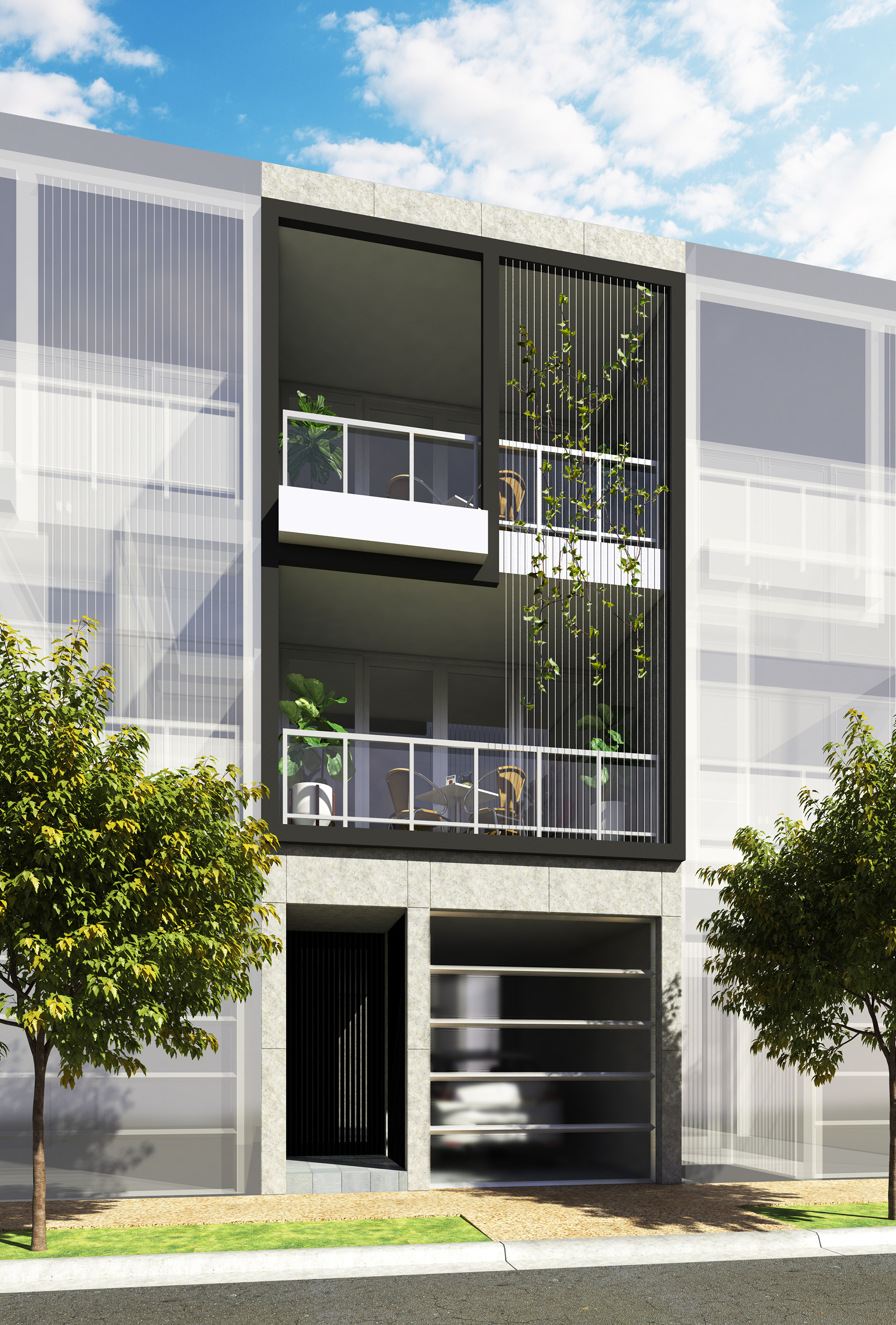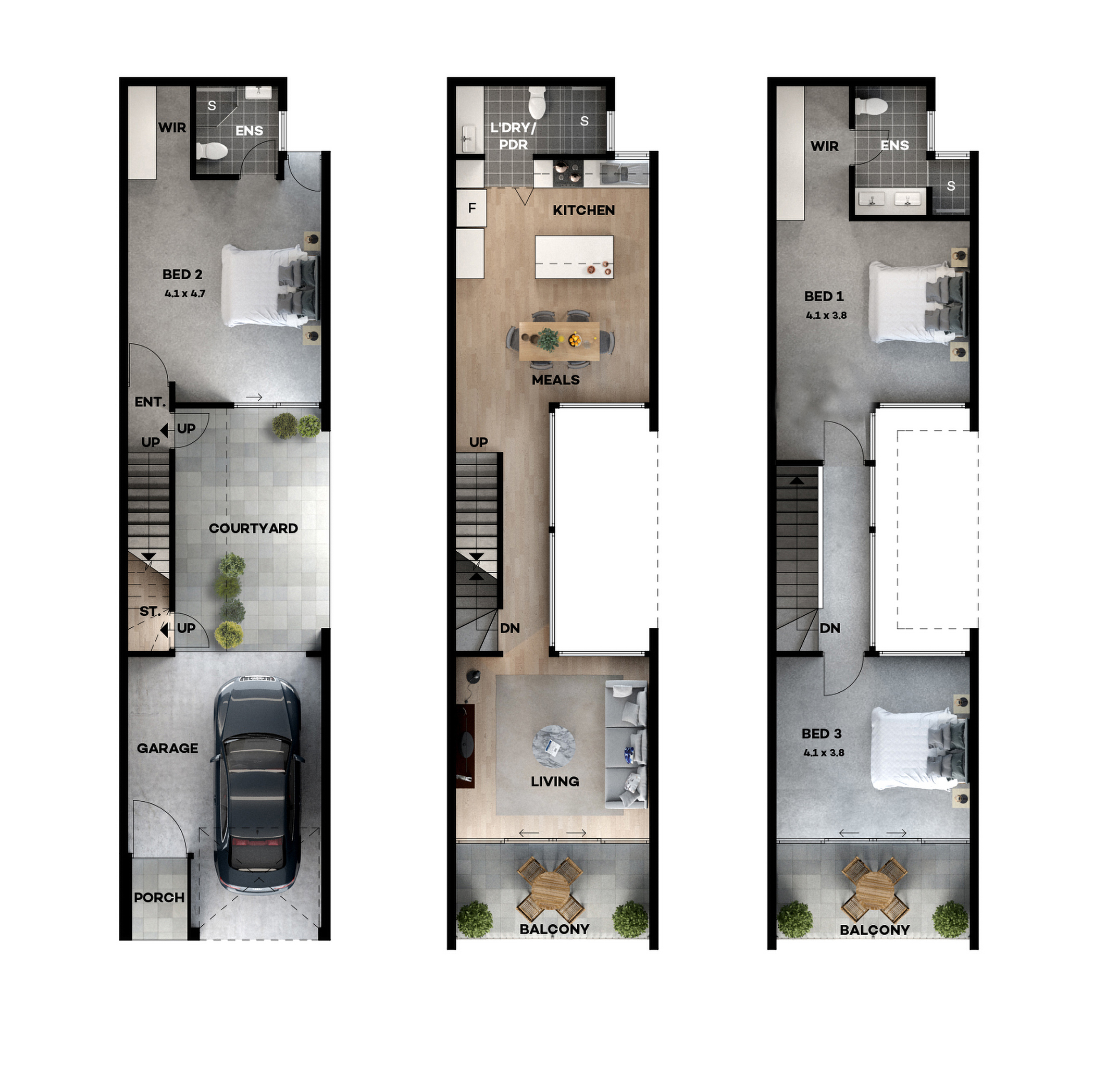 This three level home includes a garage and second bedroom at ground level that has its own bathroom and direct access to the courtyard.