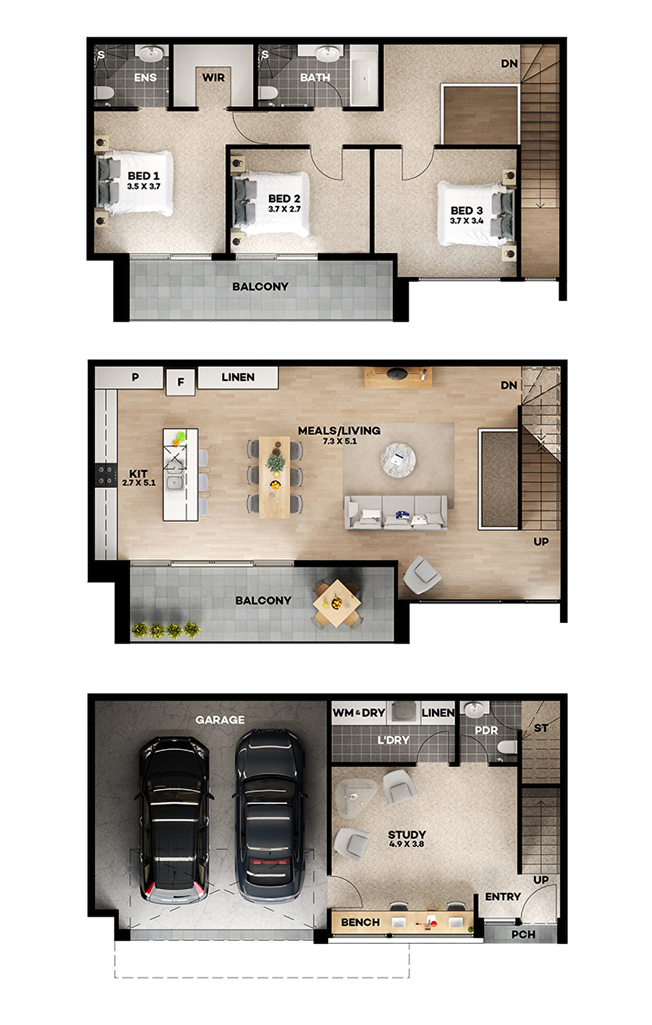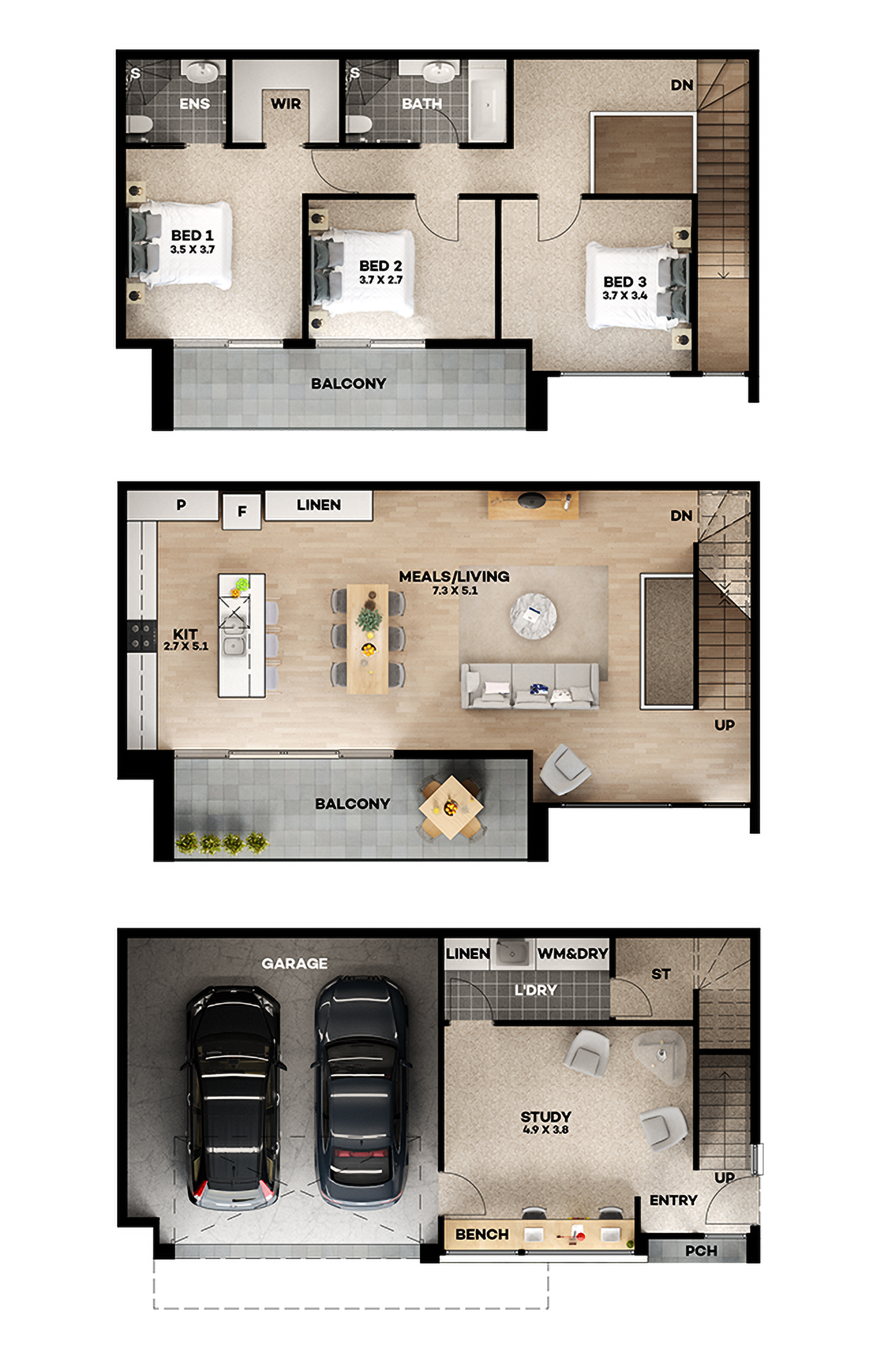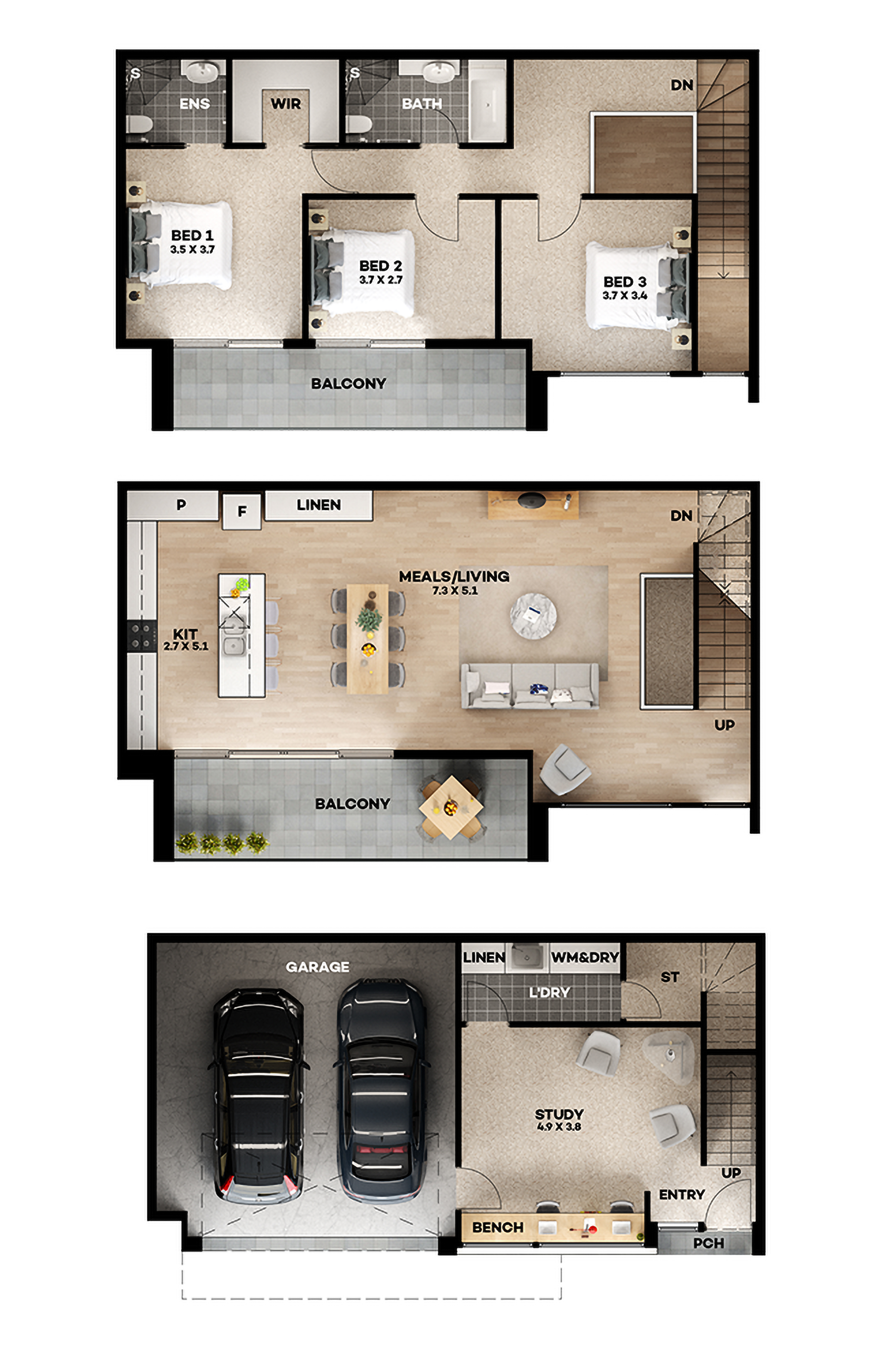 Set over three storeys, the three-bedroom, two-bathroom home boasts expansive living areas and a separate studio, lounge or study located on the ground floor.